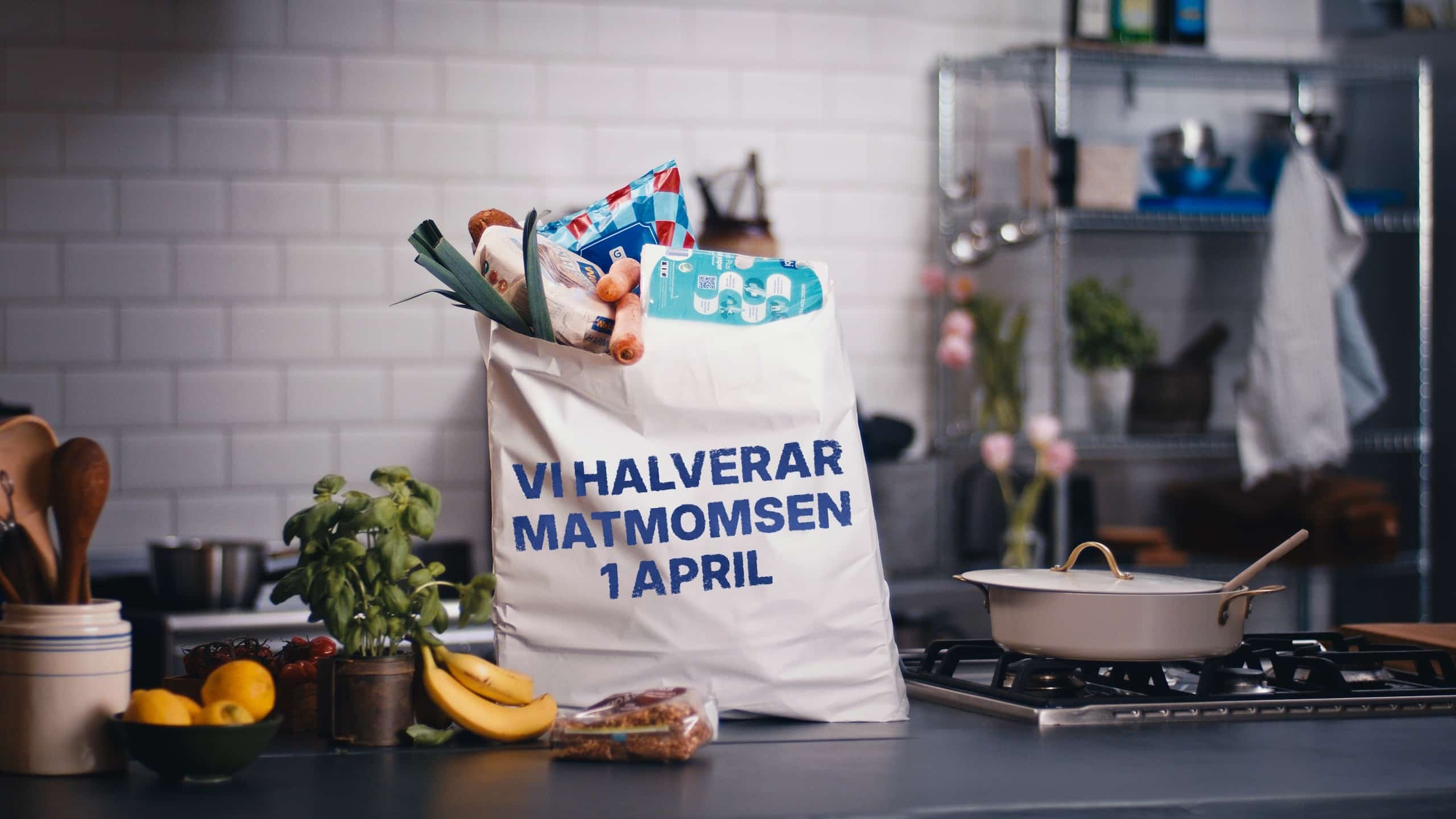 Den 1 april blir din matkasse billigare tack vare Moderaterna. Vi halverar matmomsen för att du och din familj ska få behålla mer pengar i plånboken.